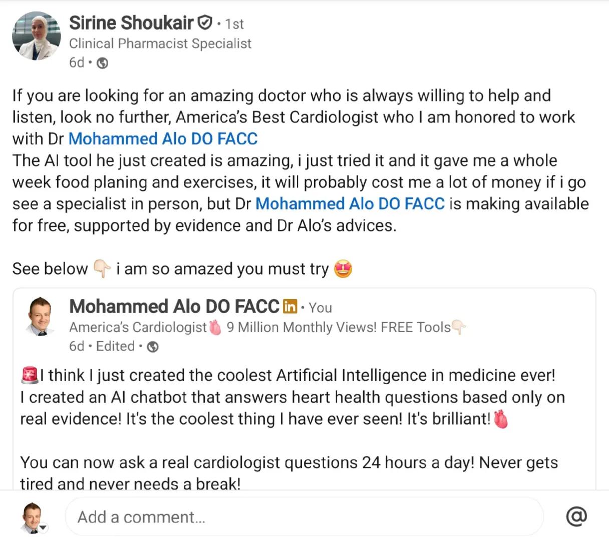 If you haven't tried my AI cardiologist, you really need to! Never sleeps! Gives you accurate, evidence based cardiology advice 24/7! Click on Ask Me Anything in my links! ðªð»ð«ð©º ðšI think I just created the coolest Artificial Intelligence in medicine ever! I created an AI chatbot that answers heart health questions based only on real evidence! It's the coolest thing I have ever seen! It's brilliant!ð« You can now ask a real cardiologist questions 24 hours a day! Never gets tired and never needs a break! Ask... I'm 46 with an LDL of 127, what should I do? Can design a meal plan for me that's 1800 calories and heart healthy? Should I check an apoB? Fish or butter? Show me the studies! Wha